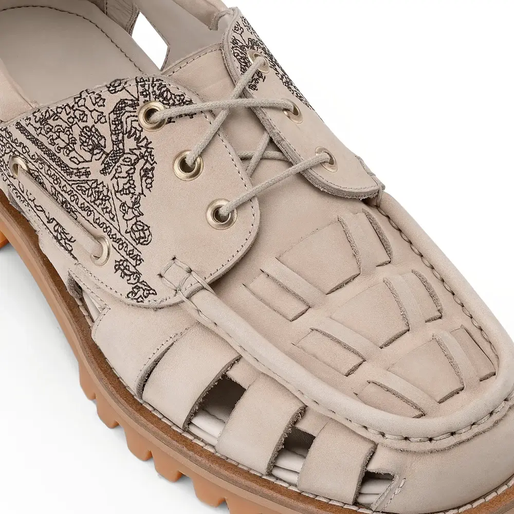 Upgrade your casual footwear collection with the Aziza Fisherman Boat Shoes, designed for those who value comfort, style, and durability. Made from high-quality beige leather, these shoes feature intricate black detailing for a modern twist on the classic fisherman style.