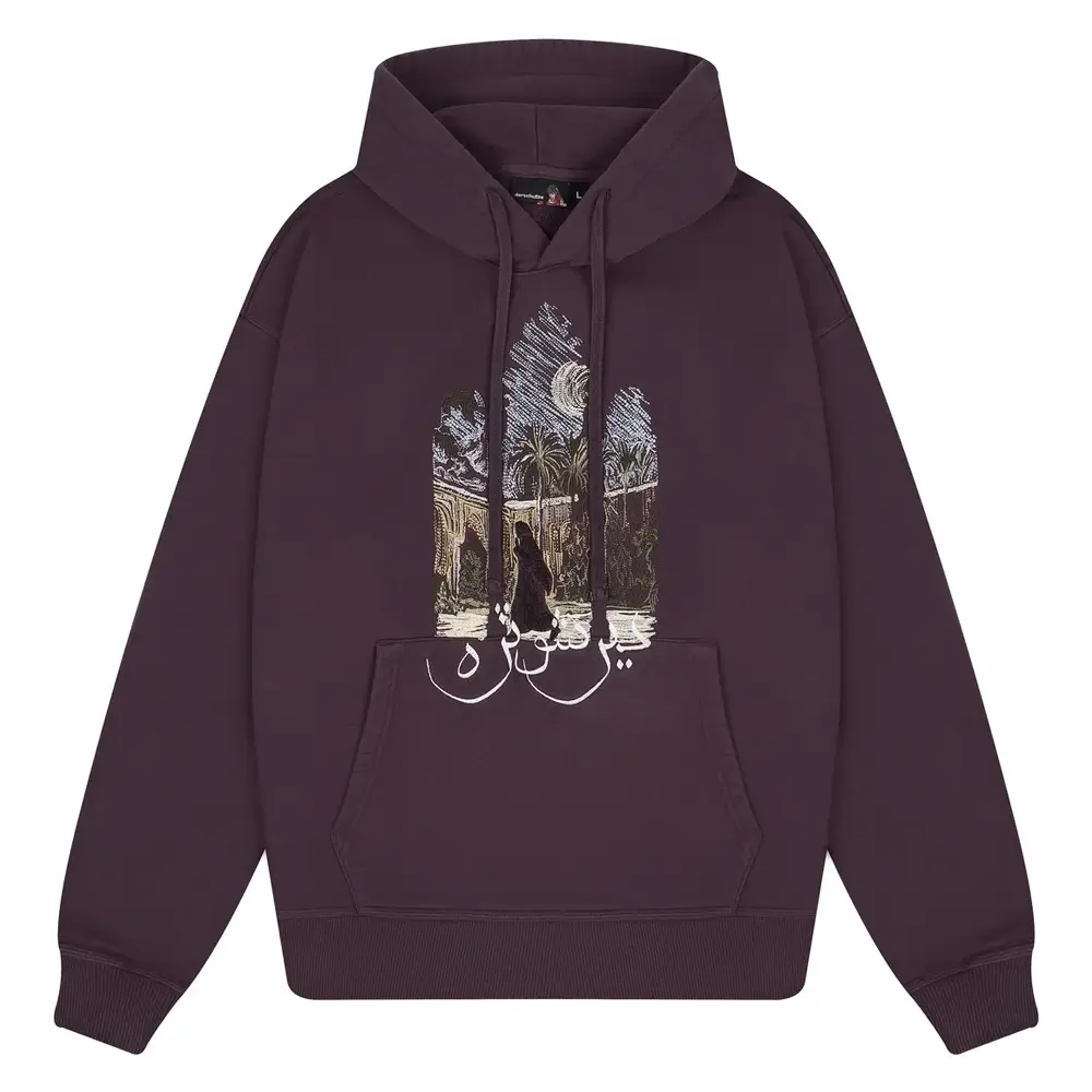 Aziza Fleece Hoodie Purple blends cultural design with modern streetwear comfort. Crafted in a rich purple shade, it features a detailed front graphic inspired by architecture and Arabic calligraphy, creating a strong and meaningful visual look.