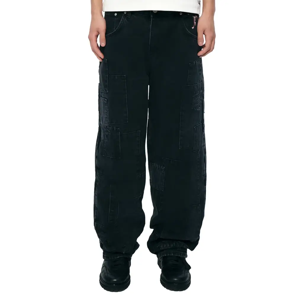 - Bold black denim with artistic patchwork detailing for a standout look
