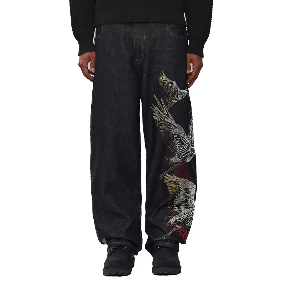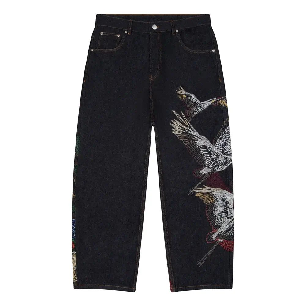 Elevate your denim game with the Kyoto Indigo Raw Denim in a classic black wash. Featuring intricate embroidery of cranes and scenic landscapes, this pair offers a unique twist on traditional Japanese artistry. The detailed stitching on both the front and back adds an exquisite touch, making them a standout piece in any wardrobe.