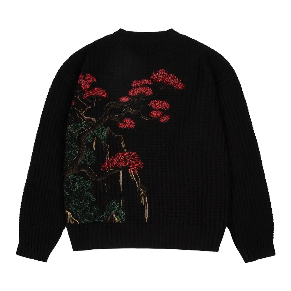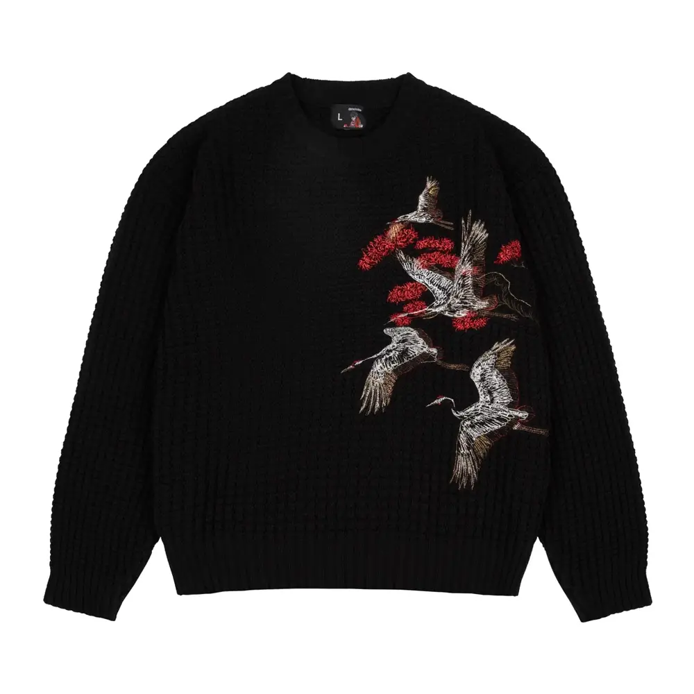 Embrace timeless elegance with the Kyoto Knit Black Sweater. Crafted with meticulous, handcrafted embroidery, this sweater brings together traditional art and modern fashion. The back features a stunning tree design, adorned with vibrant red flowers, while the front showcases graceful cranes flying amidst the same blooming floral pattern.