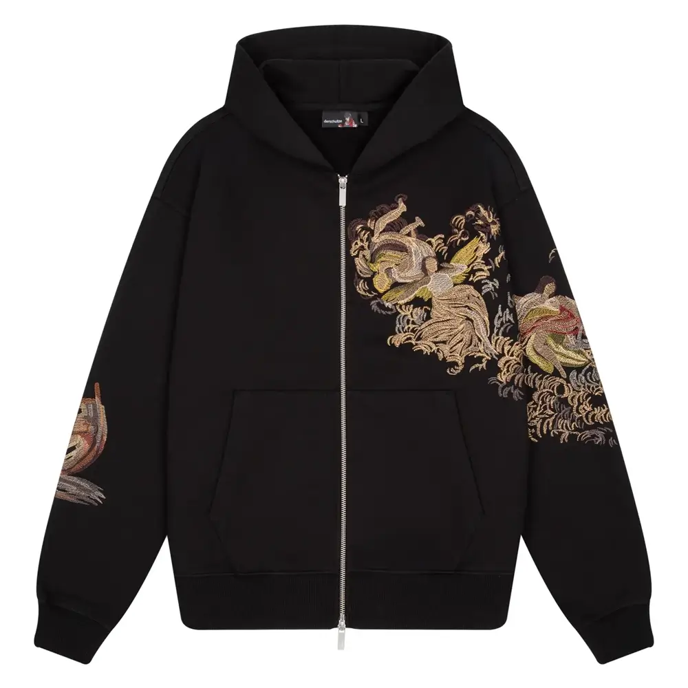Step into the world of bold fashion with the Renaissance Hoodie Zip Up Derschutze. Featuring intricate embroidery inspired by classic Renaissance art, this black hoodie blends timeless design with modern streetwear for a unique, artistic look.