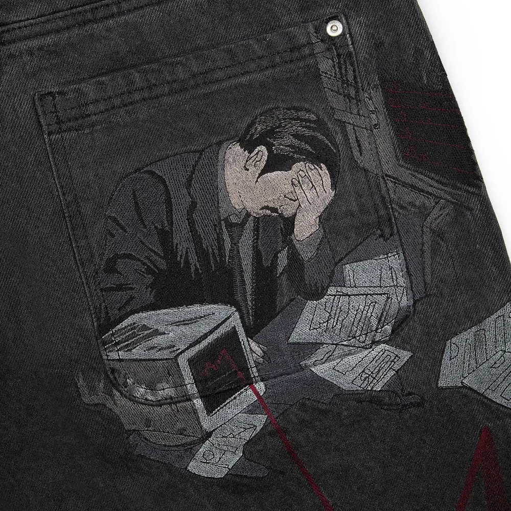 Step up your style with Wall Street Denim Waxed. Crafted with sleek, black denim, these jeans feature a glossy waxed finish that sets them apart from ordinary denim. The subtle artistic details add a sophisticated edge, making them the perfect blend of refinement and attitude. Whether you’re creating a street chic look or looking to elevate your casual wardrobe, these jeans make a bold statement.