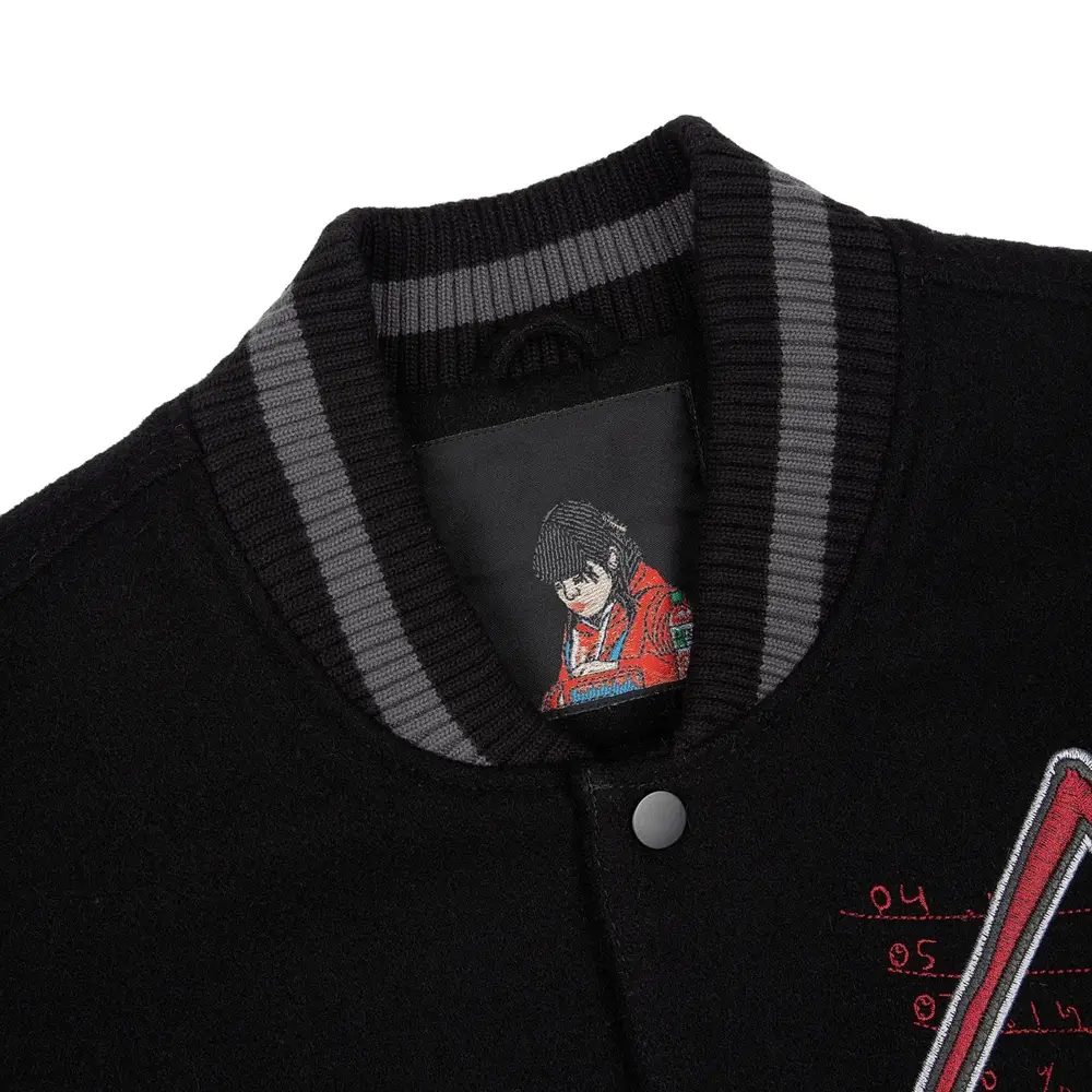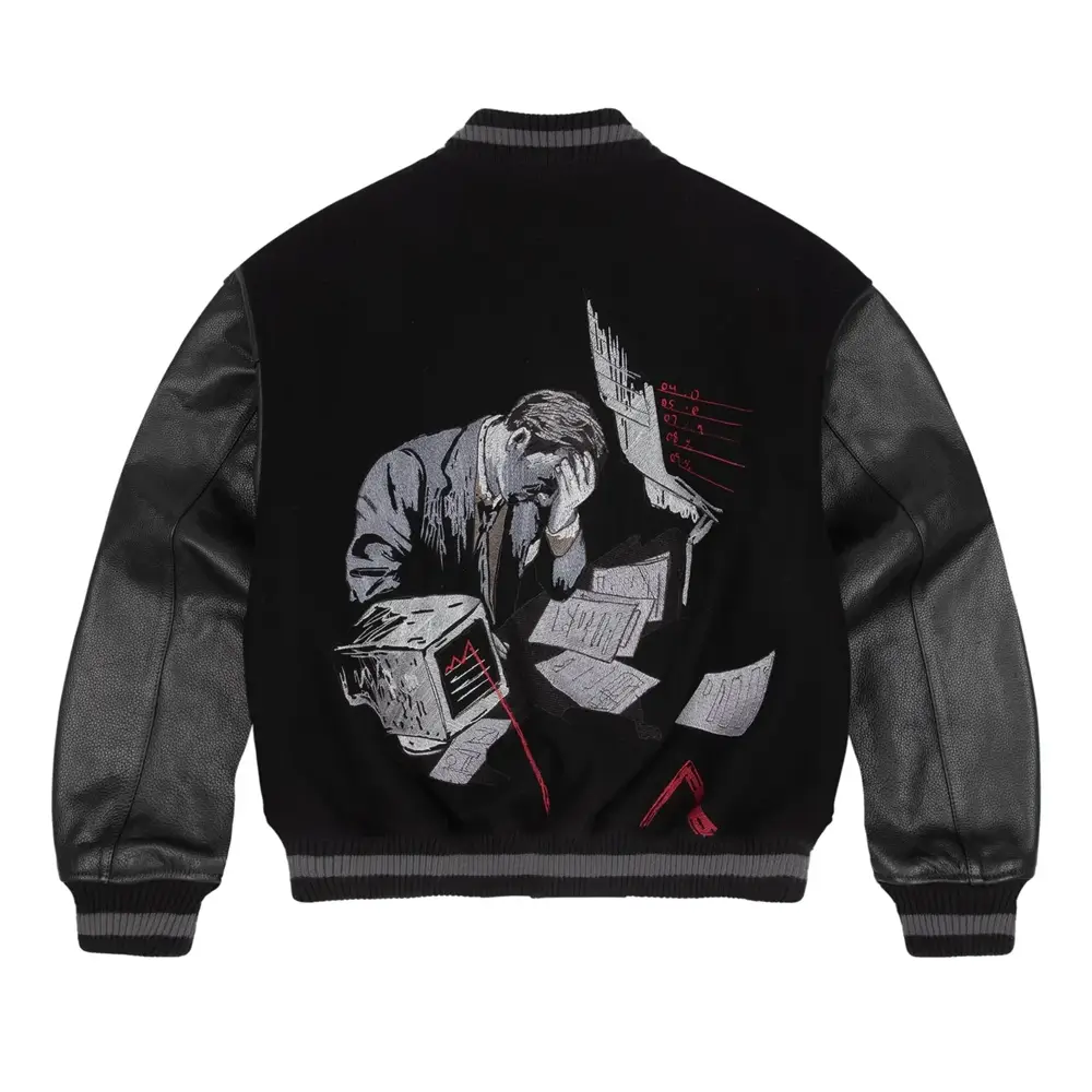 The Wall Street Varsity Jacket blends high fashion with classic streetwear. Featuring a dramatic embroidered design on the back, this jacket tells a powerful story of corporate pressure and frustration, symbolized through intricate arrows and scattered paper motifs. The embroidered design captures the chaotic essence of modern work environments while adding a bold, artistic statement to your wardrobe.