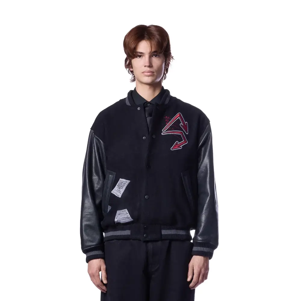 - Bold Aesthetic: With striking arrows and scattered paper designs on the front, this varsity jacket makes a powerful fashion statement.