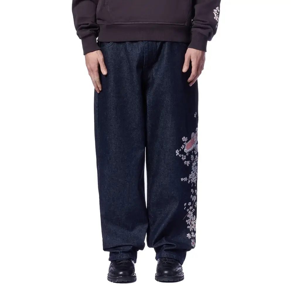The deep indigo color creates a sleek, timeless look, with subtle branded accents for refined streetwear appeal. Perfect with hoodies, T-shirts, or jackets, the Yakuza Indigo Raw Denim Dark Blue is versatile for casual outings, layering, or urban streetwear outfits, delivering both style and practical wearability.