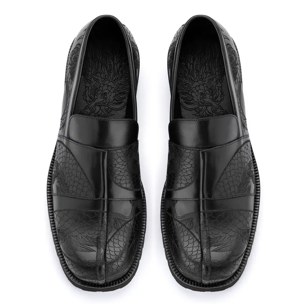 Step into the future of footwear with the Yakuza V2 Loafer a luxurious blend of comfort, durability, and style. Designed for trendsetters, these black leather loafers feature exquisite dragon embossing, symbolizing power and precision. Crafted from premium materials, they offer an unbeatable combination of elegance and durability, making them the perfect wardrobe addition.